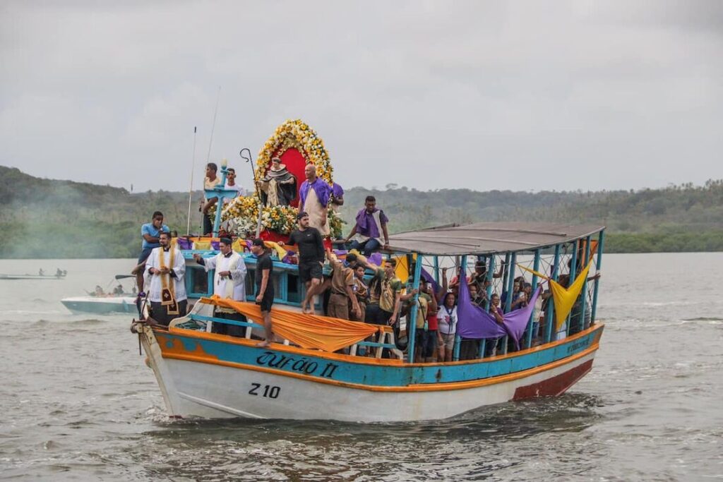 Entre os momentos mais aguardados está a tradicional Buscada, marcada para o dia 4 de janeiro. Reconhecida como a terceira maior procissão fluvial do país, a celebração reúne milhares de devotos e centenas de embarcações em um cortejo marítimo que transforma o litoral em um grande cenário de fé. Barcos e lanchas seguem em procissão, com cantos, orações e demonstrações públicas de devoção, em uma das imagens mais emblemáticas do ciclo festivo de Itapissuma.