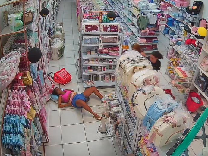 Imagens de uma câmera de segurança mostram vendedoras ajudando cliente a fazer parto no chão do estabelecimento.