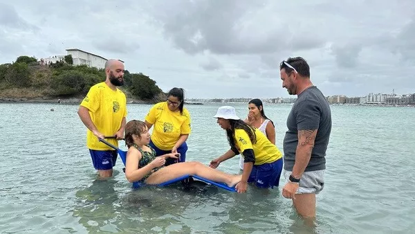 A experiência no mar foi realizada com o uso de cadeiras anfíbias, que possibilitam a entrada na água com conforto e acompanhamento de instrutores capacitados. Além disso, os participantes receberam kits com bolsa, camisa UV e viseira, e as crianças presentes na praia ganharam pulseiras de identificação, reforçando o cuidado e a segurança durante toda a ação.