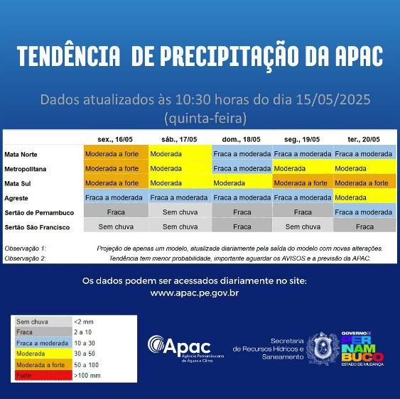 A previsão para esta sexta-feira (16), ainda é de chuva segundo a Agência Pernambucana de Águas e clima (APAC), foi emitido um alerta nesta quinta-feira (15), de estado de observação, indicando a continuidade de pancadas de chuva durante a noite da quinta-feira e ao longo do dia desta sexta-feira, com intensidade moderada (pontualmente forte), na Região Metropolitana do Recife e Zona da Mata. O volume de chuva registrado foi de 167 milímetros, maior que a média histórica para o mês de maio.