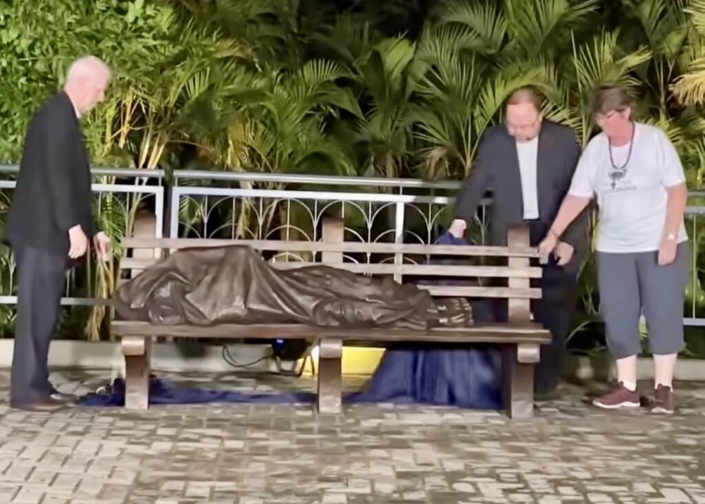 O Santuário Nacional acaba de inaugurar o monumento “Jesus Sem Teto”, uma obra de arte e devoção que convida à reflexão sobre a dignidade de cada pessoa que vive nas ruas ou em situação de vulnerabilidade social. A escultura representa Jesus Cristo deitado em um banco como um morador de rua, coberto apenas por um cobertor leve, com os pés marcados pelas feridas da crucificação visíveis, sinalizando que ali está o próprio Cristo identificado com os pobres e excluídos da sociedade.
