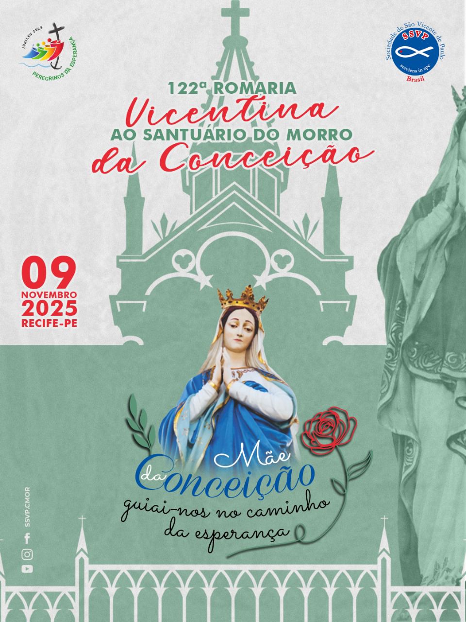 A Sociedade de São Vicente de Paulo (SSVP) realiza, no próximo dia 9 de novembro de 2025, a 122ª Romaria Vicentina ao Santuário do Morro da Conceição, em Recife. Com o tema “Mãe da Conceição, guiai-nos no caminho da esperança”, o evento é um dos mais tradicionais momentos de devoção mariana do estado, reunindo centenas de fiéis vicentinos e devotos da Imaculada Conceição.