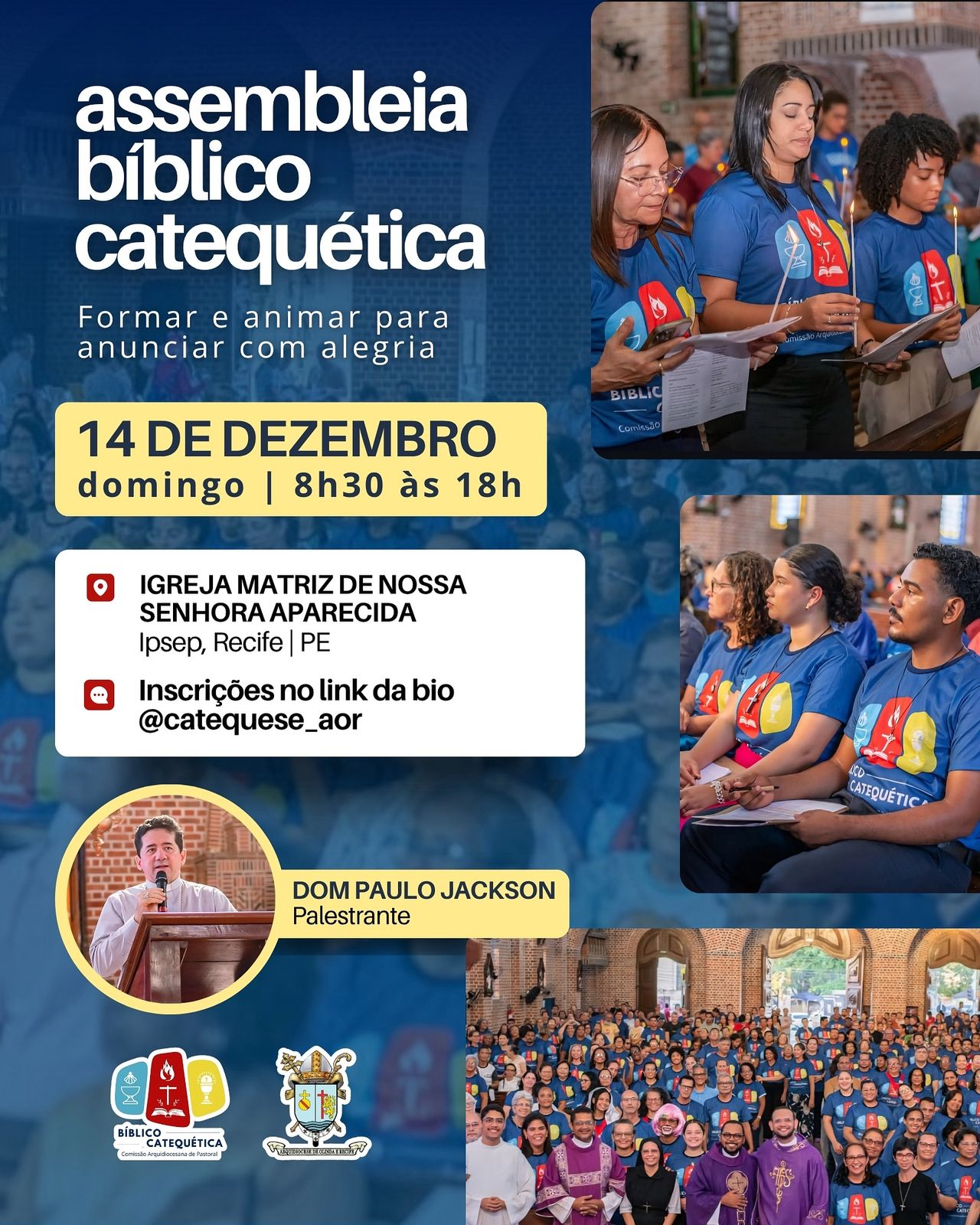 A Arquidiocese de Olinda e Recife promove, no dia 14 de dezembro, a Assembleia Bíblico-Catequética com o tema “Formar e animar para anunciar com alegria”. O encontro acontecerá das 8h30 às 18h, na Igreja Matriz de Nossa Senhora Aparecida, localizada no Ipsep, Recife (PE).