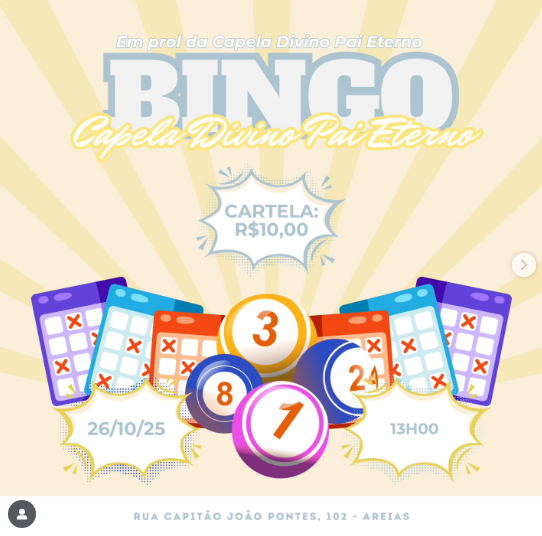 A Paróquia Santa Luzia, localizada no bairro da Estância, promove no Domingo, 26 de outubro, o Bingo da Capela Divino Pai Eterno, em benefício da própria comunidade. O evento será realizado a partir das 13h, na Rua Capitão João Pontes, 102 – Areias, e promete uma tarde de alegria, confraternização e solidariedade.