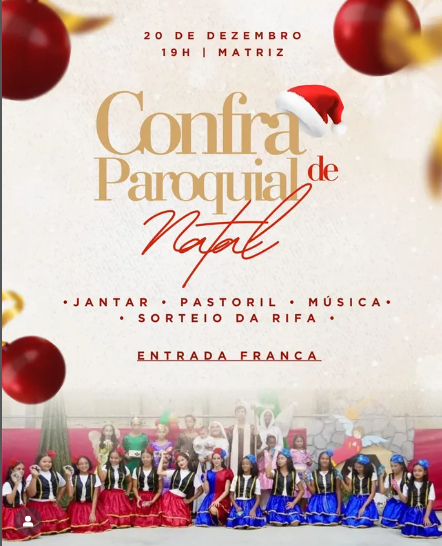 A programação contará com um jantar especial, apresentações culturais, entre elas o tradicional Pastoril da Paróquia, além de momentos de música e alegria que animarão a comunidade. Como parte das atividades, haverá também o sorteio da rifa, ação que contribui para a manutenção das obras e serviços pastorais da paróquia.