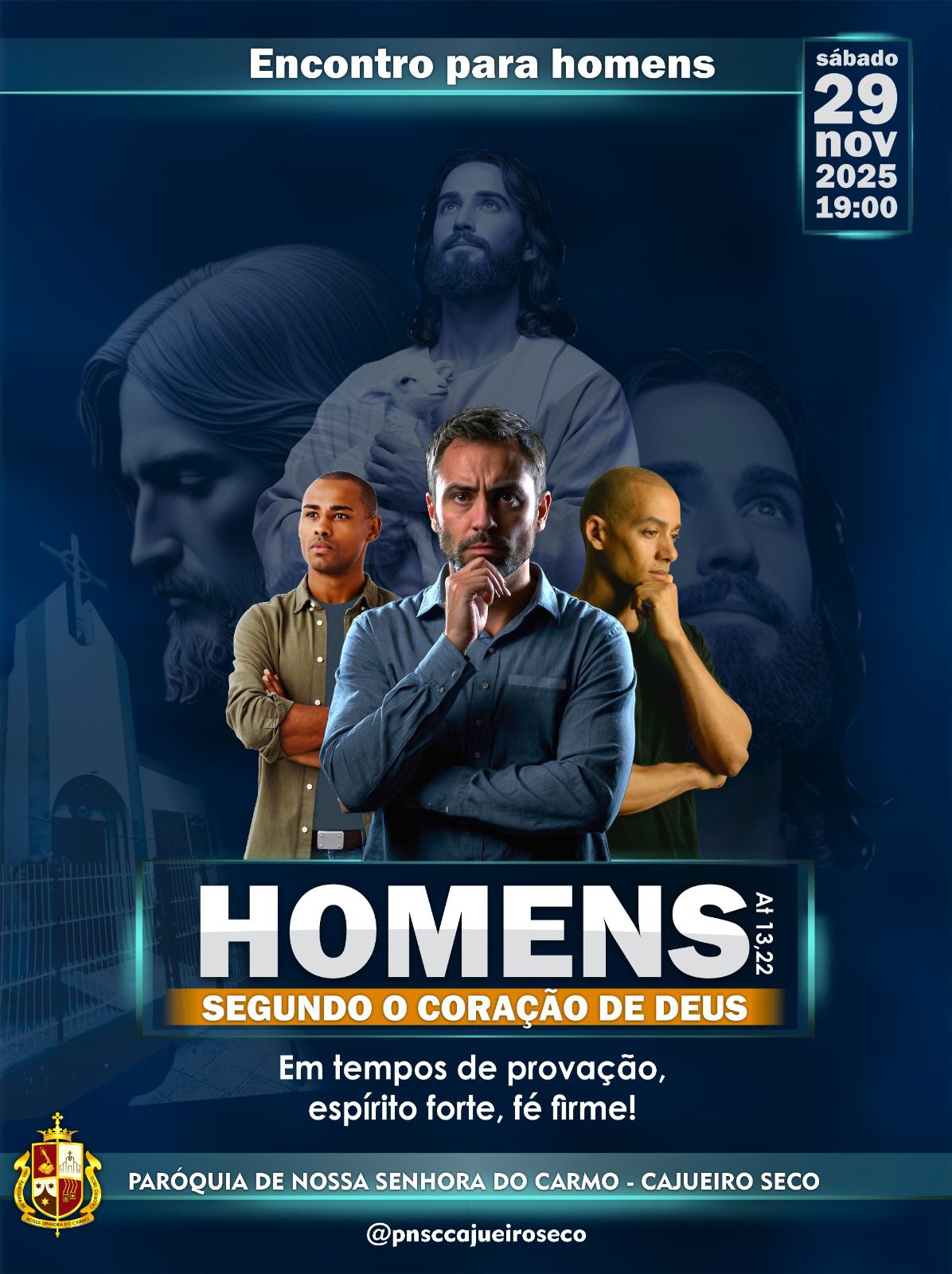 A Paróquia de Nossa Senhora do Carmo, em Cajueiro Seco, promoverá no próximo dia 29 de novembro, às 19h, o Encontro para Homens, com o tema “Segundo o Coração de Deus”. O evento tem como proposta proporcionar um momento de fé, reflexão e fortalecimento espiritual, reunindo homens que desejam alinhar sua vida à vontade de Deus.