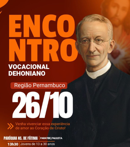 A Região Pernambuco dos Padres Dehonianos realiza, no próximo sábado (26 de outubro), o Encontro Vocacional Dehoniano, um momento de oração, partilha e descoberta do chamado de Deus. O evento será sediado na Paróquia Nossa Senhora de Fátima, em Paratibe, Paulista, a partir das 13h30.