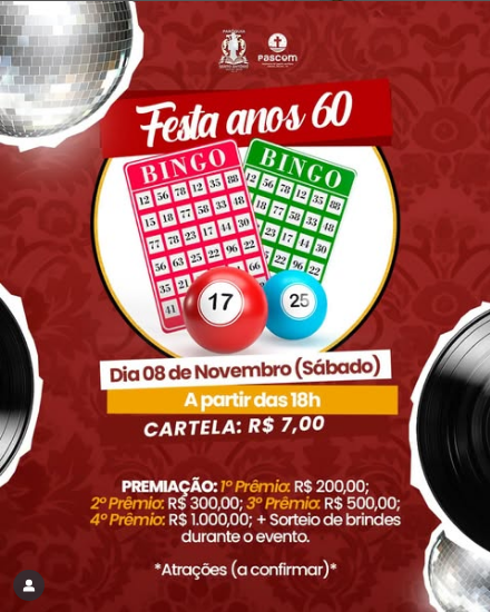 Com um clima retrô e musical inspirado na década de 1960, a programação contará com um animado bingo, cujo valor da cartela é de R$ 7,00, e que oferecerá prêmios em dinheiro e brindes especiais. Entre as premiações estão: