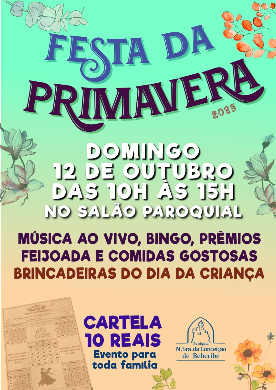 No próximo dia 12 de outubro, a Paróquia Nossa Senhora da Conceição de Beberibe realiza a Festa da Primavera 2025, um evento preparado para toda a família. A programação acontece das 10h às 15h, no salão paroquial, reunindo momentos de confraternização, alegria e solidariedade.