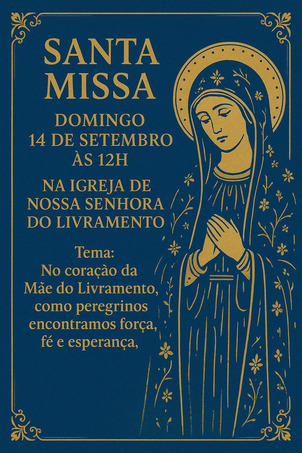 A celebração será marcada pela fé e devoção a Maria, Mãe do Livramento, que acompanha e sustenta o povo de Deus nas lutas do cotidiano, apontando sempre para Cristo, seu Filho.