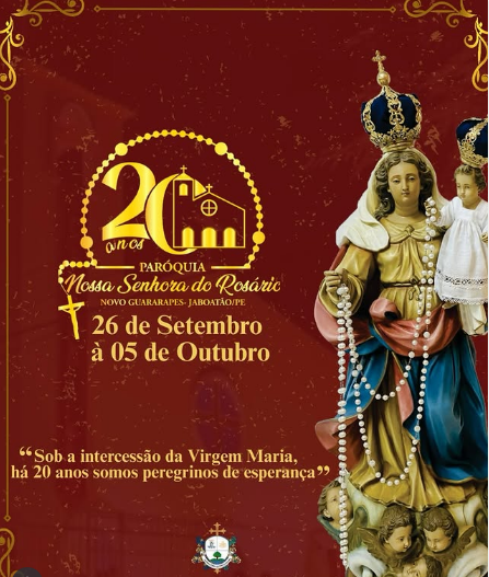 A Paróquia Nossa Senhora do Rosário, em Novo Guararapes – Jaboatão dos Guararapes, celebra entre os dias 26 de setembro e 05 de outubro a tradicional festa em honra à sua padroeira, marcada este ano pelo Jubileu dos 20 anos de criação da Paróquia. Com o tema “Sob a intercessão da Virgem Maria, há 20 anos somos peregrinos de esperança”, a programação reúne momentos de oração, Missas, procissões, devoções marianas e confraternização comunitária.