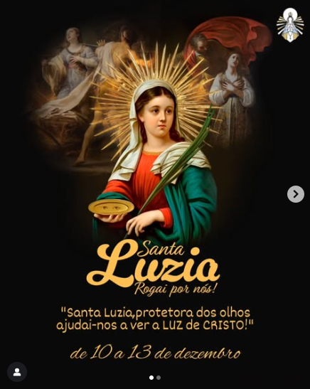 Conhecida pela sua intercessão em favor daqueles que buscam proteção e cura da visão — tanto física quanto espiritual — Santa Luzia inspira o tema deste ano: “Santa Luzia, protetora dos olhos, ajudai-nos a ver a luz de Cristo!”