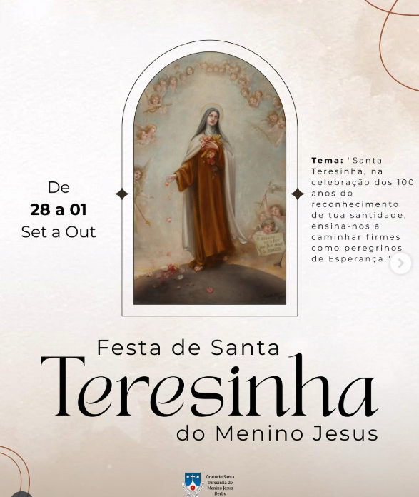 O Oratório de Santa Teresinha no Derby, sede da capelania da Polícia Militar de Pernambuco, convida todos os fiéis para a Festa de Santa Teresinha do Menino Jesus 2025, que acontecerá de 28 de setembro a 1º de outubro.
