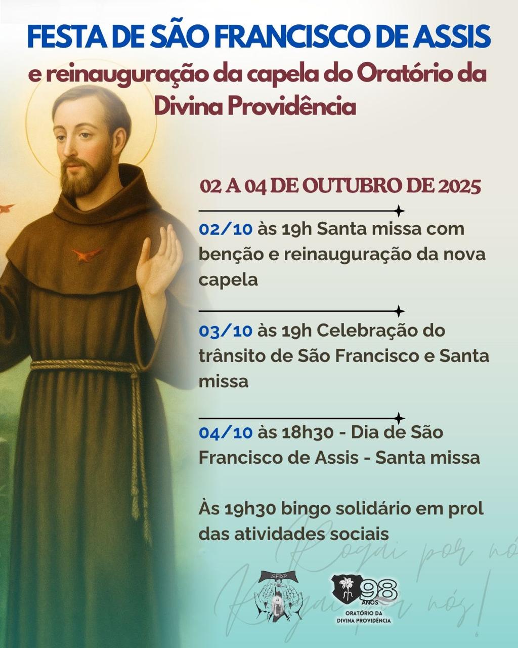 O ponto alto da festa será no dia 04 de outubro, às 18h30, com a Santa Missa em honra a São Francisco de Assis, seguida de um bingo solidário às 19h30, cuja renda será revertida para as atividades sociais do Oratório.
