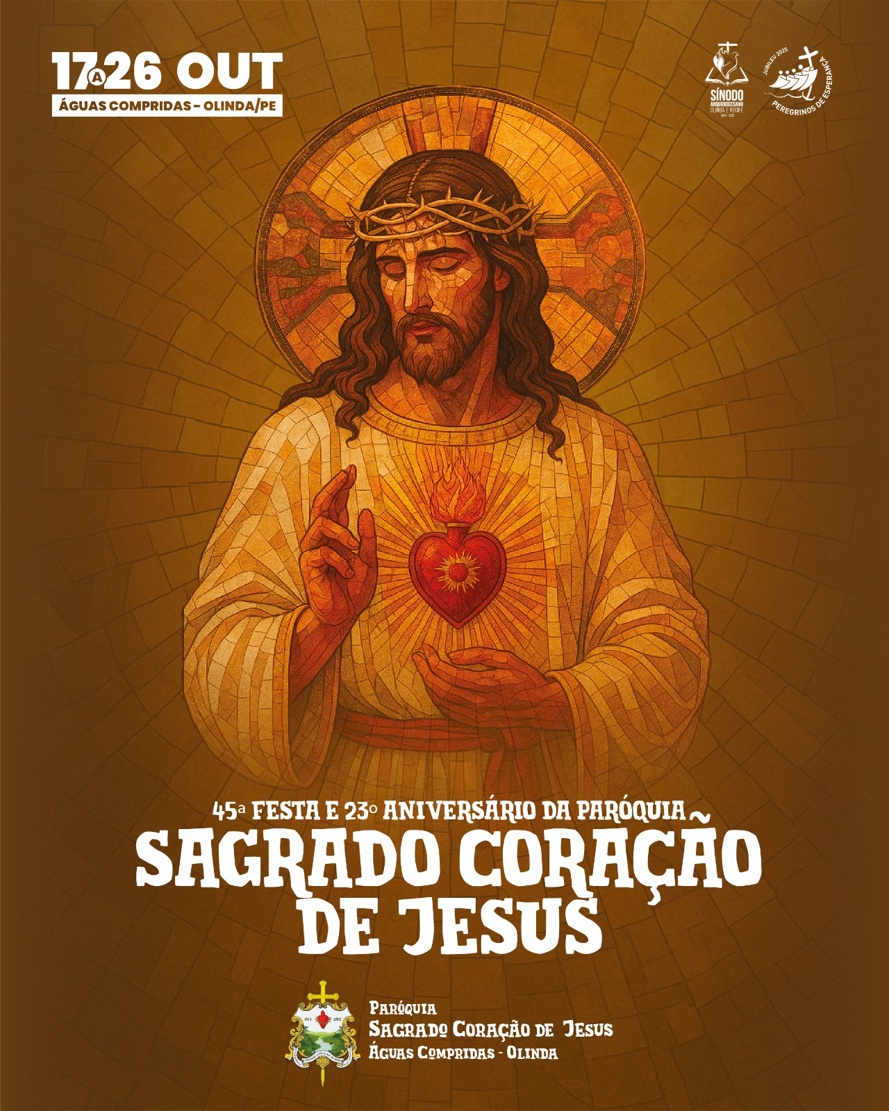 A Paróquia Sagrado Coração de Jesus, localizada na Rua 12 de Dezembro, nº 109 – Águas Compridas, Olinda/PE, realiza de 17 a 26 de outubro a 45ª Festa do Sagrado Coração de Jesus e o 23º aniversário de criação da paróquia. Com o tema “Corações ardentes, pés a caminho”, a programação reúne celebrações, momentos de oração, apresentações culturais e shows musicais, em um clima de fé, comunhão e alegria.