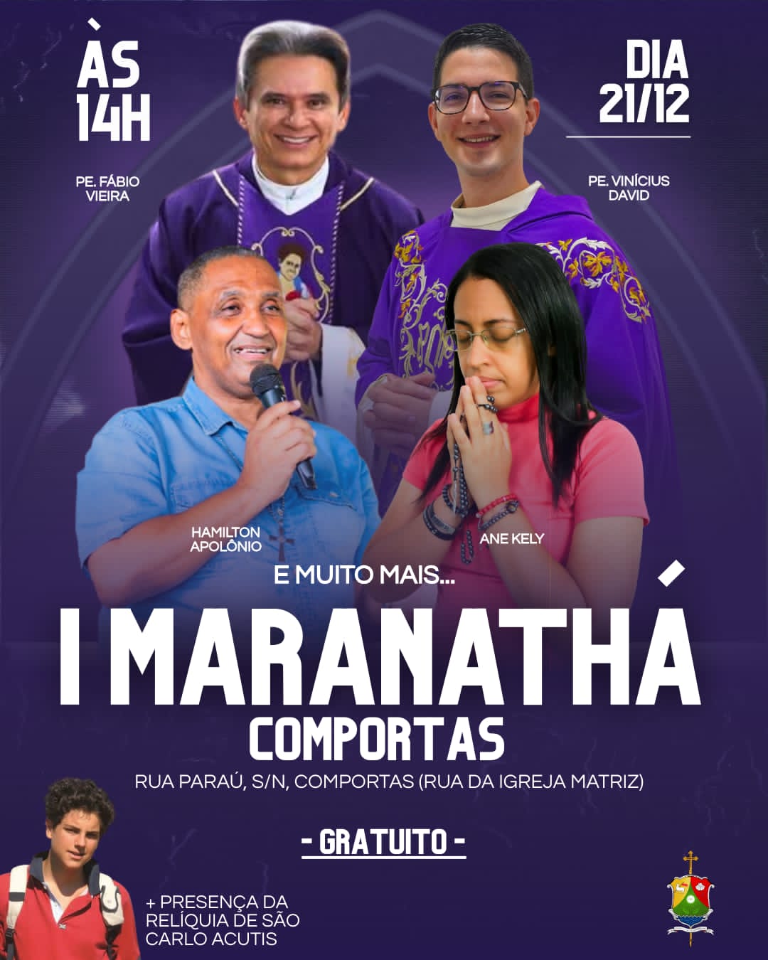 O evento contará com a participação de nomes conhecidos no cenário católico, como o Pe. Fábio Vieira, diretor nacional do Apostolado de São Carlo Acutis, e o Pe. Vinícius David, que conduzirão momentos de oração e reflexão. Também estarão presentes o missionário Hamilton Apolônio e a cantora Ane Kely, que conduzirá momentos de louvor. A organização adianta que outras atrações ainda serão anunciadas, ampliando as expectativas para esta primeira edição.