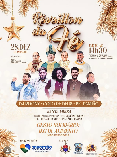 A cidade de Jaboatão dos Guararapes se prepara para viver uma noite especial de espiritualidade e celebração com a realização do Réveillon da Fé, no dia 28 de dezembro, a partir das 14h30, na Praia de Candeias, local marcado pela história, fé e devoção do povo pernambucano.