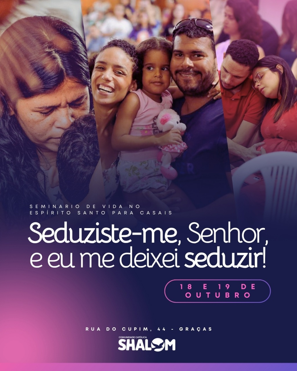 A Comunidade Católica Shalom realiza, nos dias 18 e 19 de outubro, o Seminário de Vida no Espírito Santo para Casais, com o tema inspirado nas palavras do profeta Jeremias: “Seduziste-me, Senhor, e eu me deixei seduzir!”