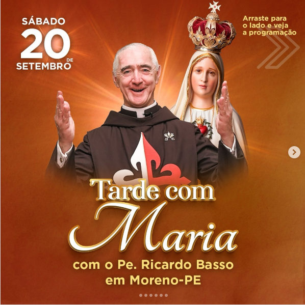 No dia 20 de setembro, o Mosteiro dos Arautos do Evangelho, em Moreno (PE), promove o encontro “Tarde com Maria”, conduzido pelo Padre Ricardo Basso, EP. O evento tem como proposta fortalecer a devoção mariana e proporcionar aos fiéis um momento de espiritualidade e formação.