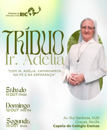 As Religiosas da Instrução Cristã (RIC) promovem, entre os dias 11 e 13 de outubro, o Tríduo em memória da Irmã Adélia, uma das videntes das aparições de Nossa Senhora em Cimbres, no município de Pesqueira (PE). Com o tema “Com Ir. Adélia, caminhamos na fé e na esperança”, o momento será realizado na Capela do Colégio Damas, localizada na Avenida Rui Barbosa, 1426, bairro das Graças, Recife.